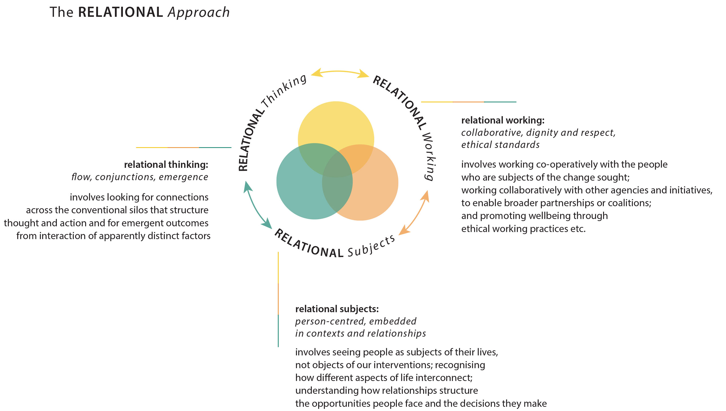 The relational approach is at the core of RWB. This too has three aspects — relational thinking, relational working, and the idea of people as relational subjects embedded in relationships with others and their contexts.