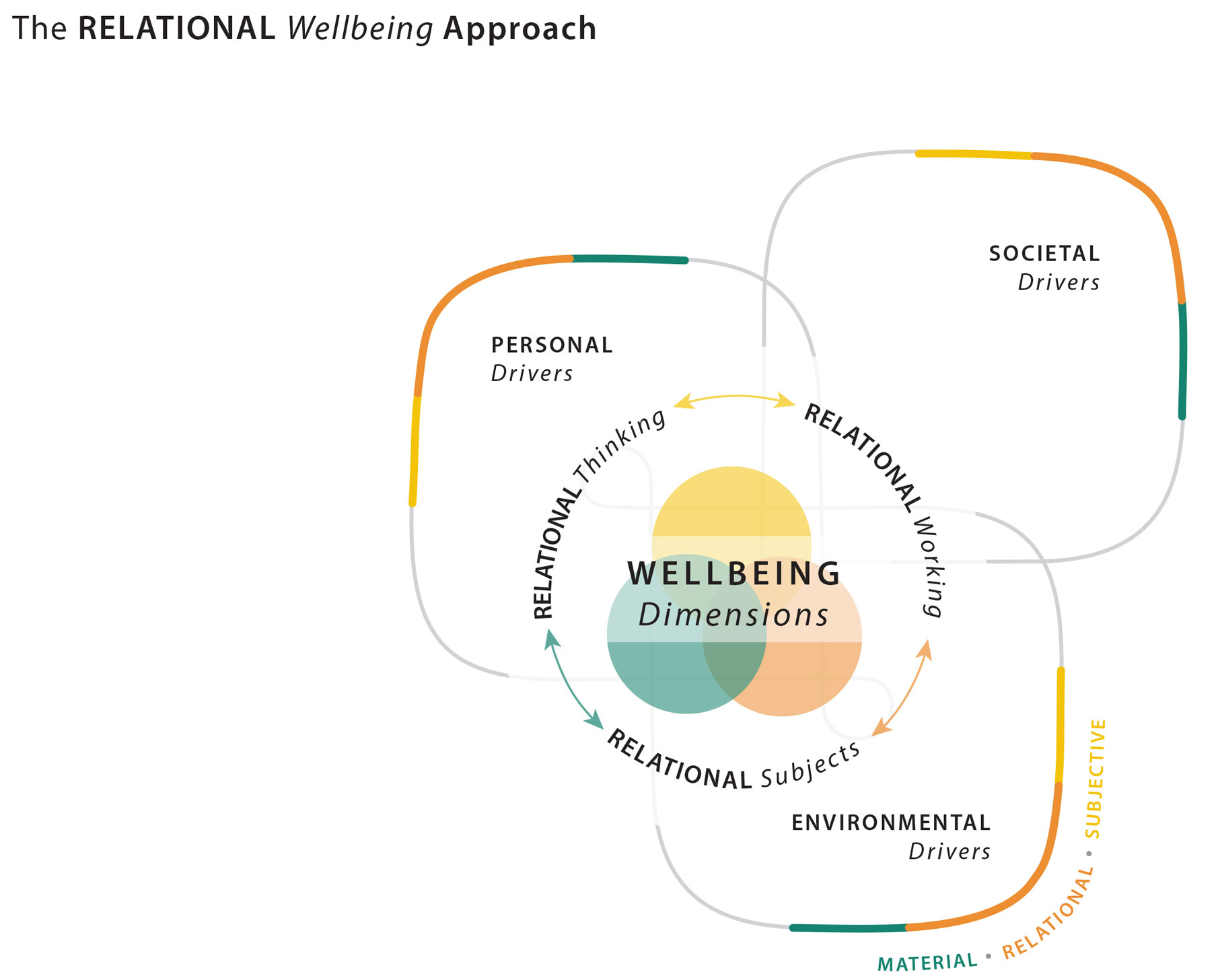 It targets three forms of underlying drivers of wellbeing: personal, which has to do with personality and personal history; societal, which is concerned with social norms, economy, and culture; and environmental, which looks at the built environment, climate, and ecological sustainability. The relational approach focuses on both wellbeing outcomes and processes.